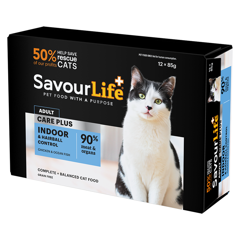 SavourLife Care Plus Indoor & Hairball Control Chicken & Ocean Fish Pâté is a premium, grain-free formula designed to support the unique needs of indoor cats.