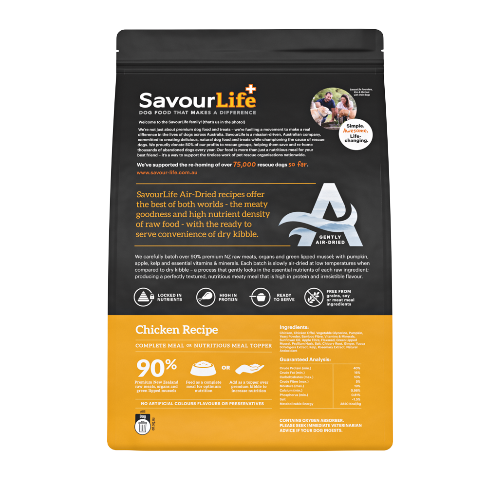 SavourLife Air-Dried recipes offer the best of the both worlds - the meaty goodness and high nutrient density of raw food - with the ready to serve convenience of dry kibble.