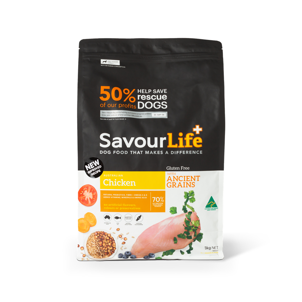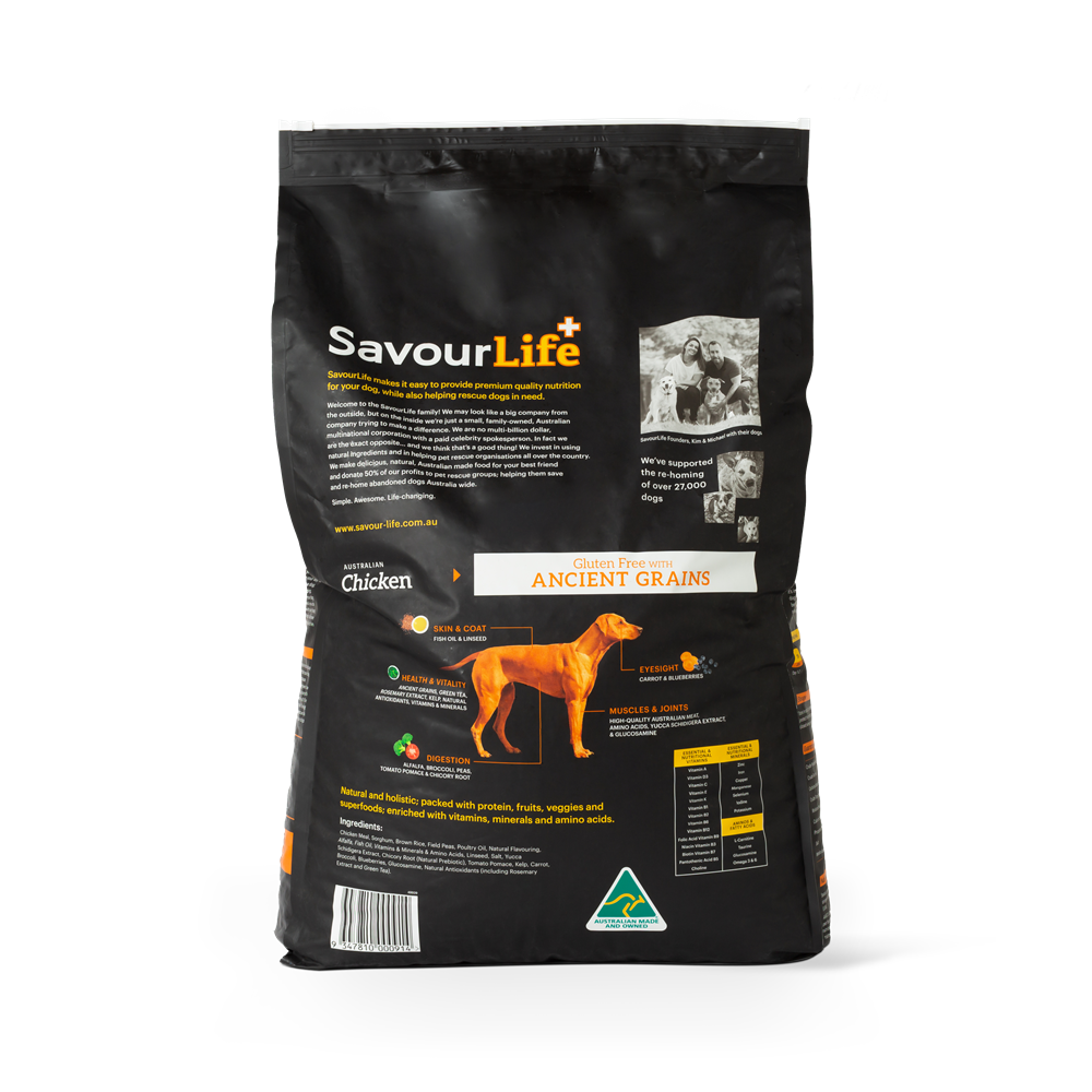 SavourLife’s Ancient Grains Chicken dog food is an all-natural, holistic, Australian-made, gluten-free food with natural superfood inclusions like chicory, kelp and blueberries. It is bursting with Australian meat plus vitamins, minerals, natural prebiotics and amino acids. It contains no artificial flavours, colours or preservatives. Chicken is a very popular source of protein for all dogs and a great choice for those fussy eaters! Chicken is also known for being gentle on the tummy and with added glucosamine this may be a great choice for older dogs too.