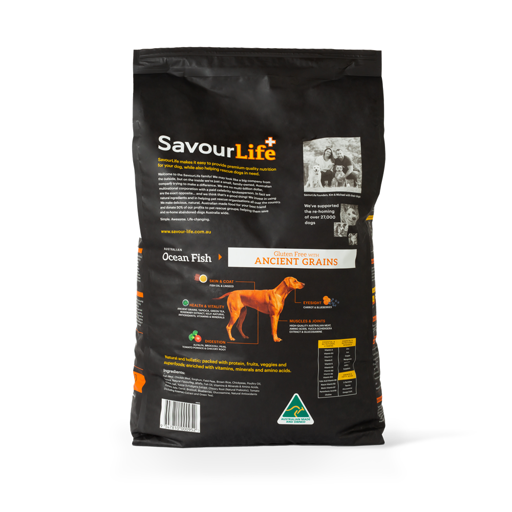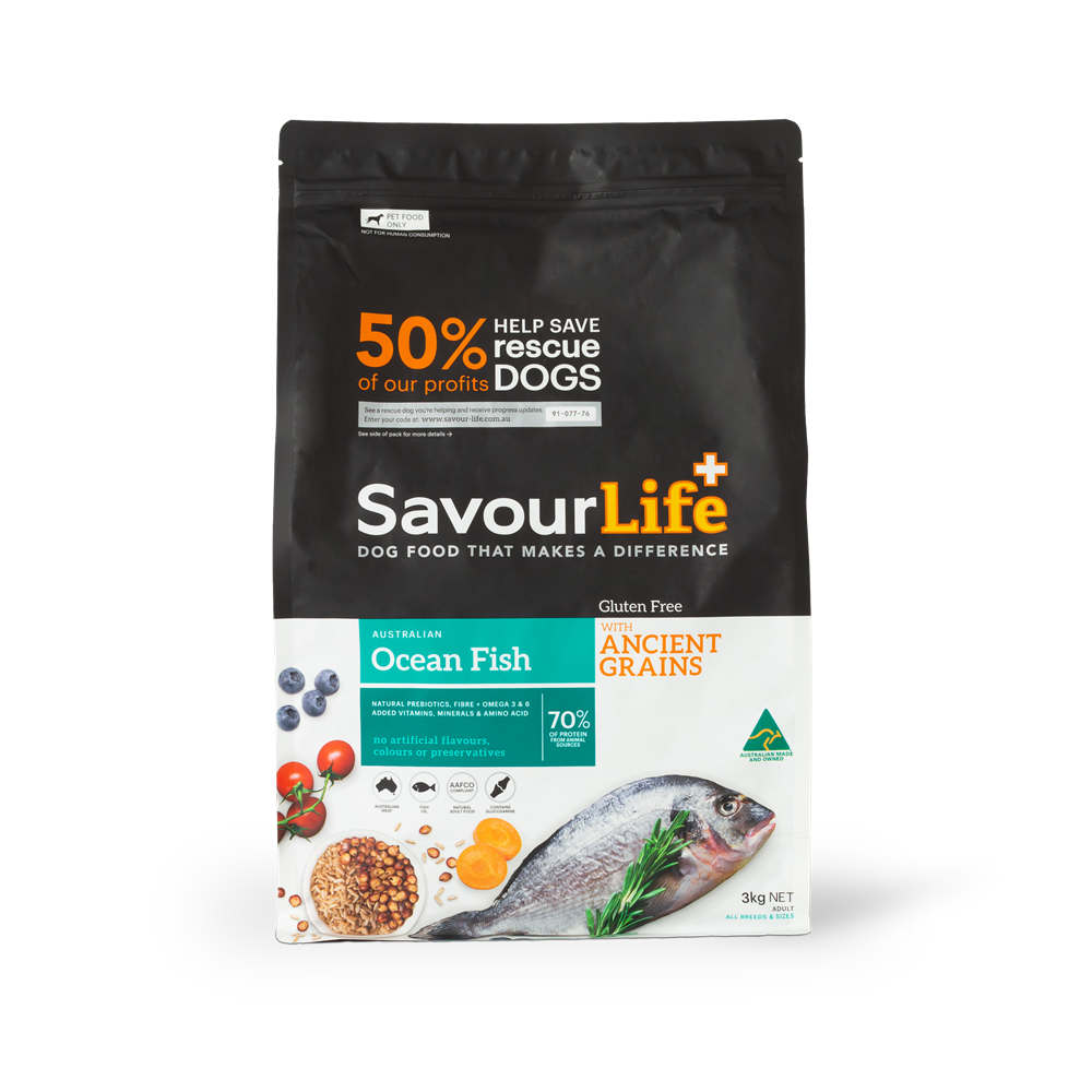 SavourLife’s Ancient Grains Ocean Fish dog food is an all-natural, holistic, Australian-made, gluten-free dog food with natural superfood inclusions like chicory, kelp and blueberries. It is bursting with Australian meat plus vitamins, minerals, natural prebiotics and amino acids. It contains no artificial flavours, colours or preservatives. Excellent for dogs with allergies, and with a burst of Omega 3&6 is perfect for a shiny coat and healthy skin.