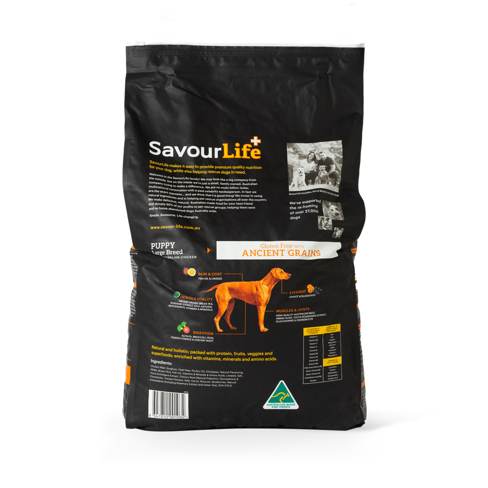 The first months of a puppy’s life are crucial to their long-term health and well-being. Puppies require more nutrients and energy than older dogs to help them grow into the best dog they can be. With all the healthy vitamins, minerals and nutrients to ensure your puppy’s development; SavourLife’s Ancient Grains for Puppies with Australian Chicken is an all-natural, holistic, Australian-made, gluten-free puppy food with natural superfood inclusions.