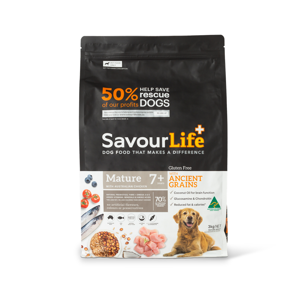 SavourLife’s Ancient Grains Mature 7+ with Australian Chicken is an all-natural, holistic, Australian-made, gluten-free dog food with natural superfood inclusions like chicory and kelp. It's bursting with single-source Australian meat plus vitamins, minerals, natural prebiotics and amino acids