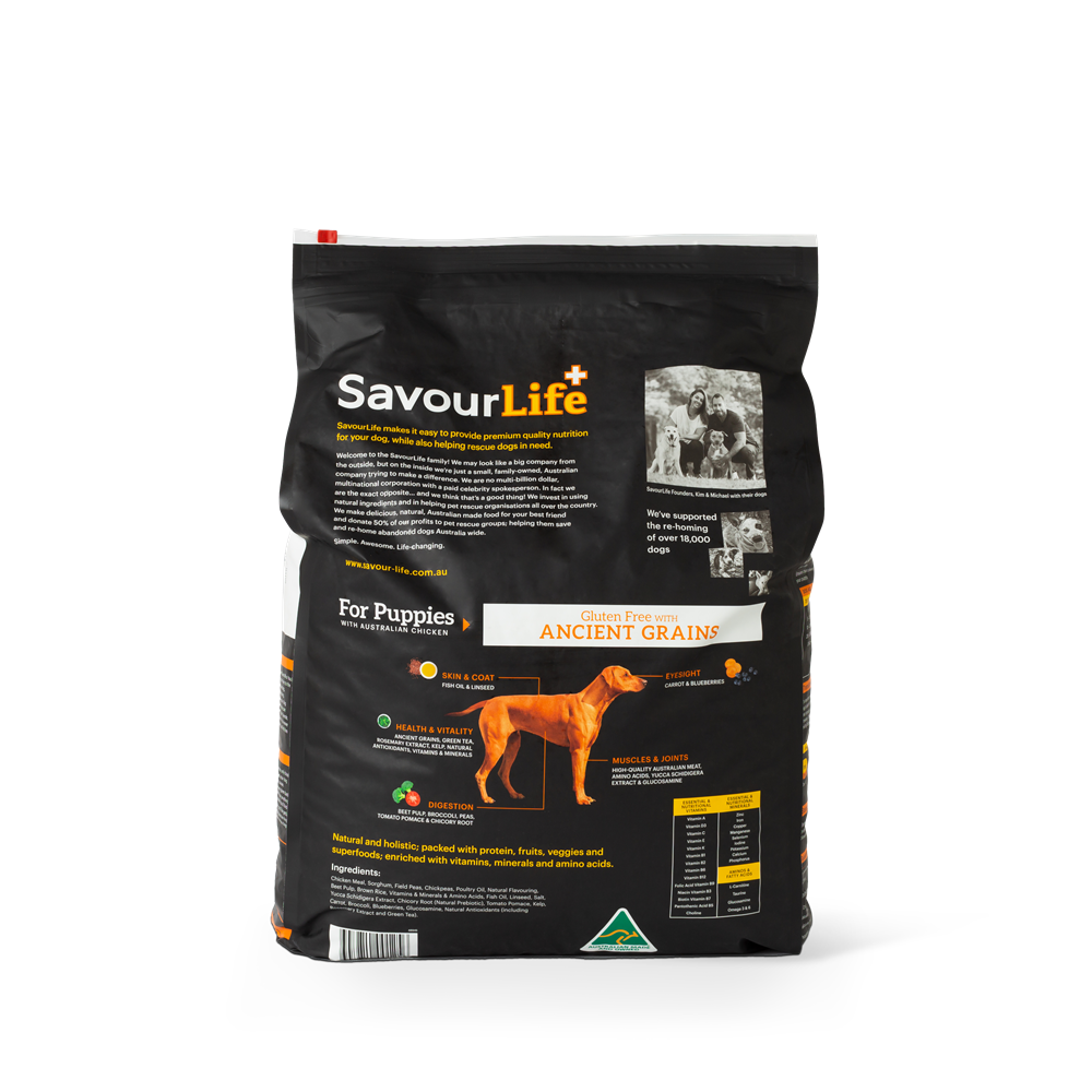The first months of a puppy’s life are crucial to their long-term health and well-being. Puppies require more nutrients and energy than older dogs to help them grow into the best dog they can be. With all the healthy vitamins, minerals and nutrients to ensure your puppy’s development; SavourLife’s Ancient Grains for Puppies with Australian Chicken is an all-natural, holistic, Australian-made, gluten-free puppy food with natural superfood inclusions.