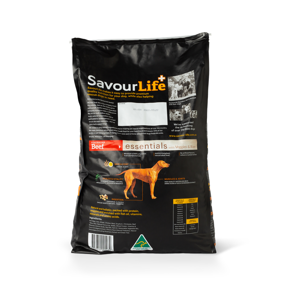 SavourLife Essentials Beef with Veggies & Rice is an all-natural, Australian-made and owned dog food, made with Australian meat and packed with seasonal vegetables, fish oil, plus vitamins, minerals, natural pre-biotics and amino acids, tailored to meet the nutritional needs of adult dogs. There are absolutely no artificial flavours, colours or preservatives. Beef is an option for dogs who like something a little different.