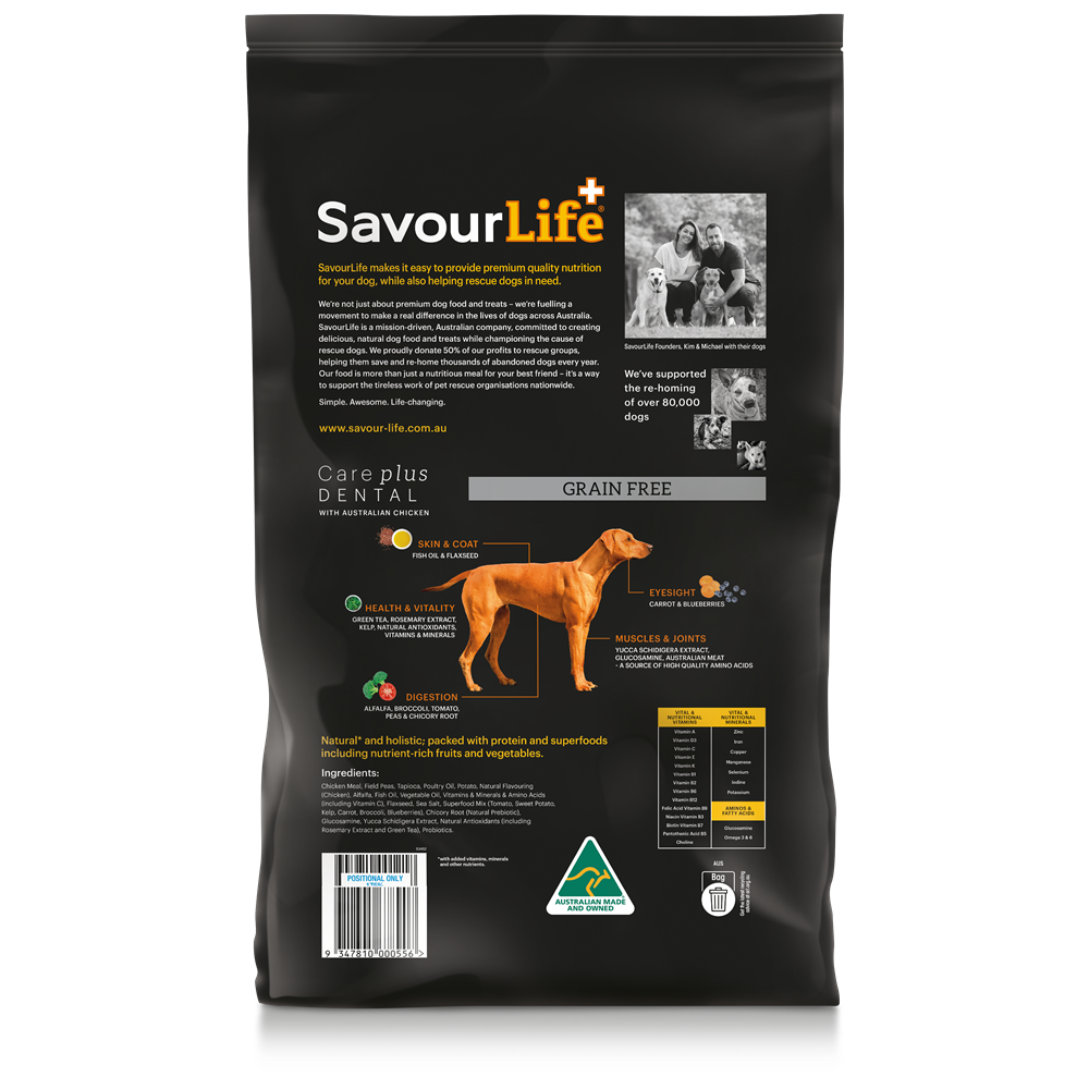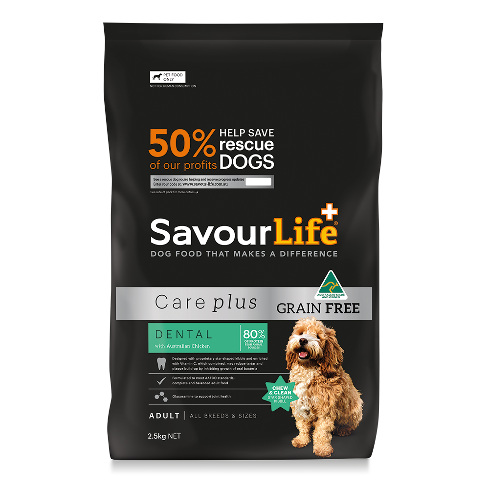 SavourLife’s Grain Free Care Plus Dental with Australian Chicken is the latest instalment of functional-health with Care Plus. Crafted for adult dogs of all breeds and sizes, Grain Free Dental is designed to provide complete dental support of teeth and gums, whilst delivering the same high-quality nutrition which Grain Free is known for.