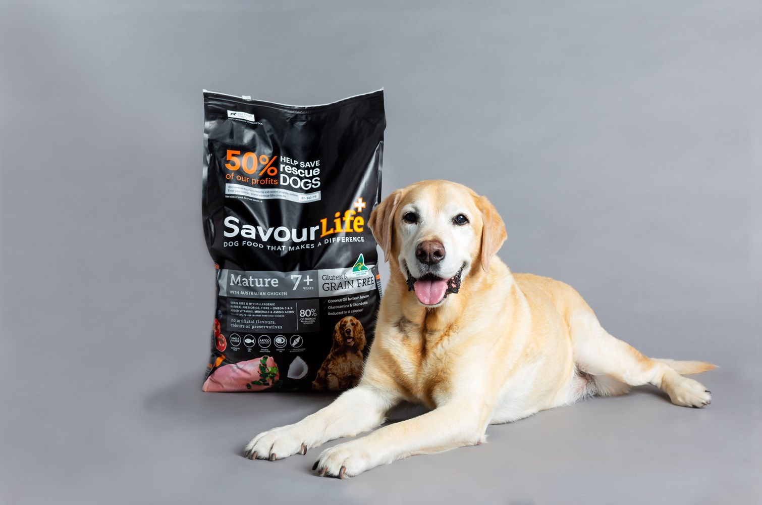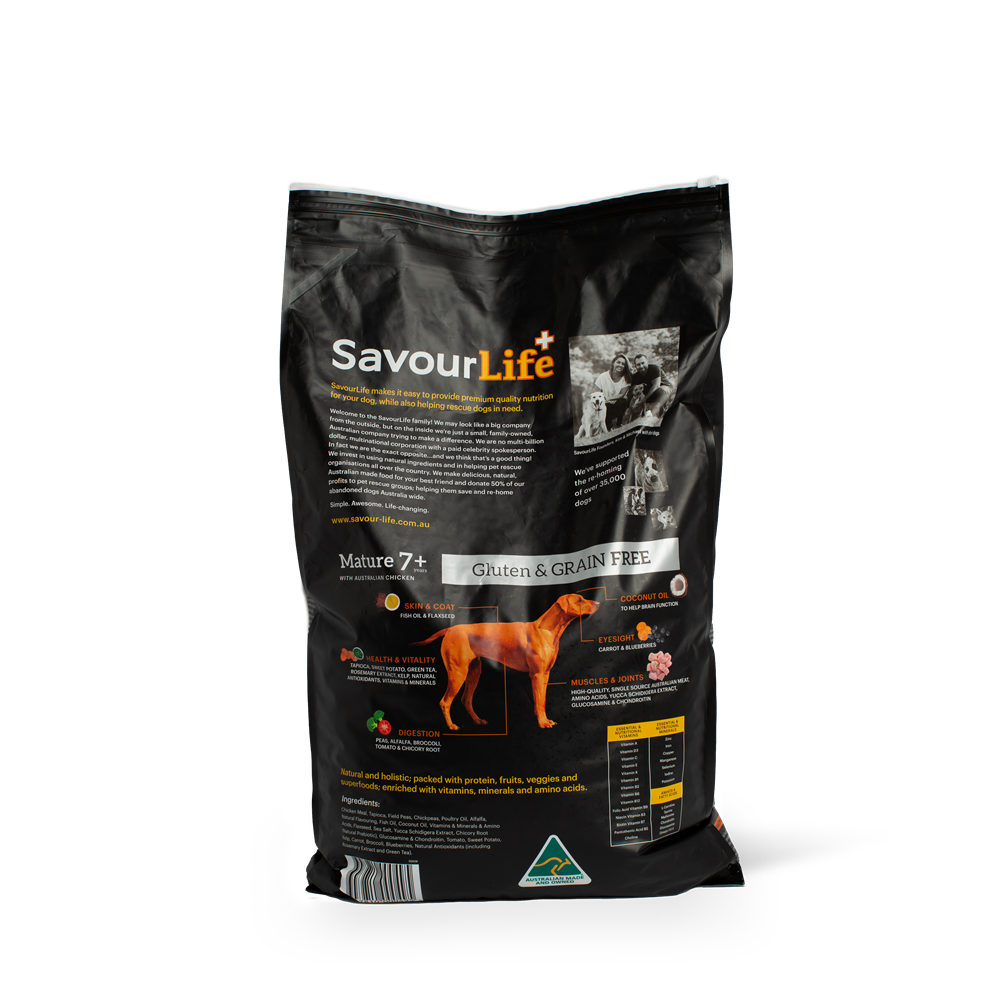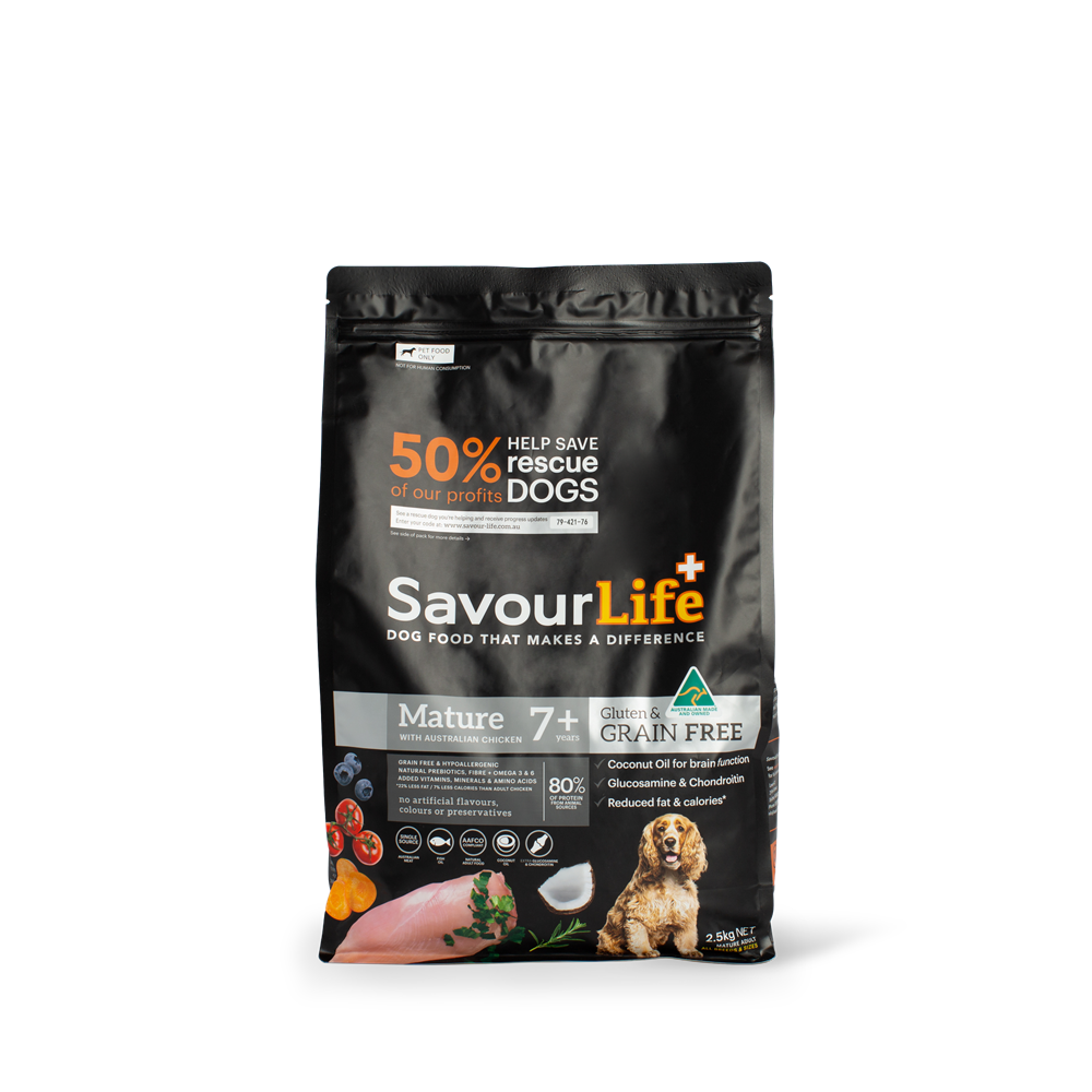 SavourLife’s Grain Free Mature 7+ with Australian Chicken is a complete dog food specifically tailored to address older dogs' digestion and dietary needs, with reduced protein, calories, and fat. It’s made in Australia with Australian Chicken and the best ingredients and inclusions like fish oil, for a soft and silky coat, as well as antioxidants like blueberries, that help prevent cell damage.