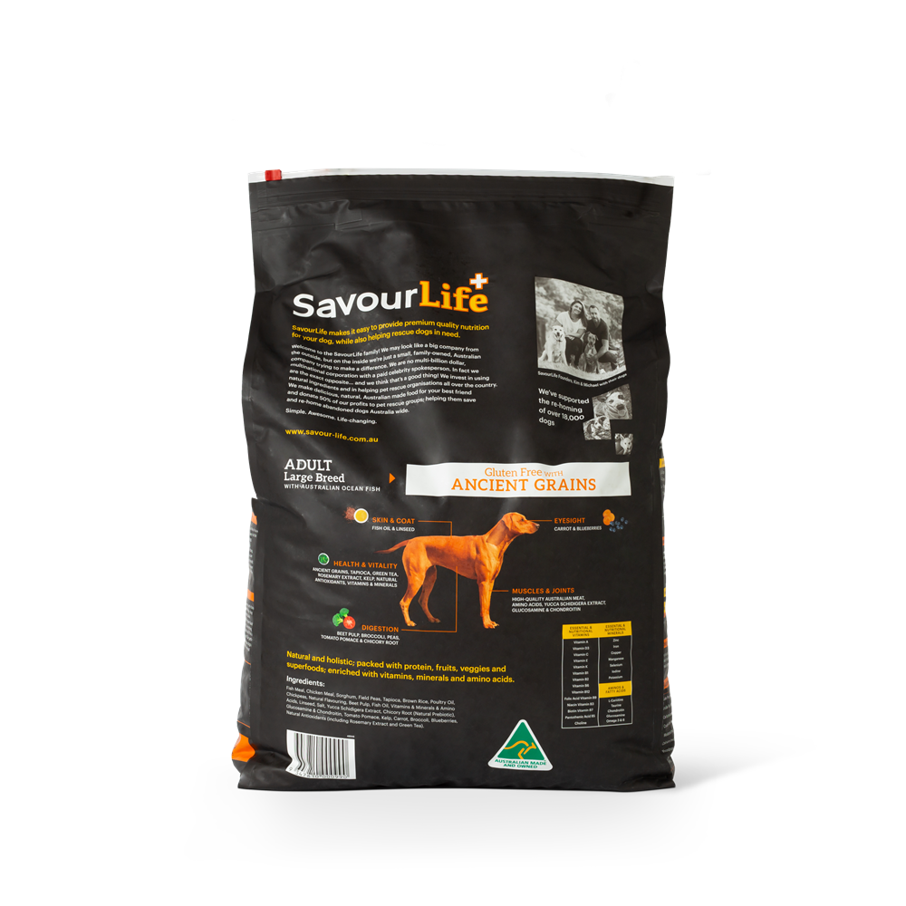 SavourLife’s Ancient Grains Large Breed with Ocean Fish food is an all-natural, holistic, Australian-made, gluten-free food with natural superfood inclusions like chicory, kelp and blueberries. It is bursting with Australian meat plus vitamins, minerals, natural prebiotics and amino acids. It contains no artificial flavours, colours or preservatives. It has specific minerals for joint health, plus special fat and calories levels designed for big dog needs, plus a larger kibble size!