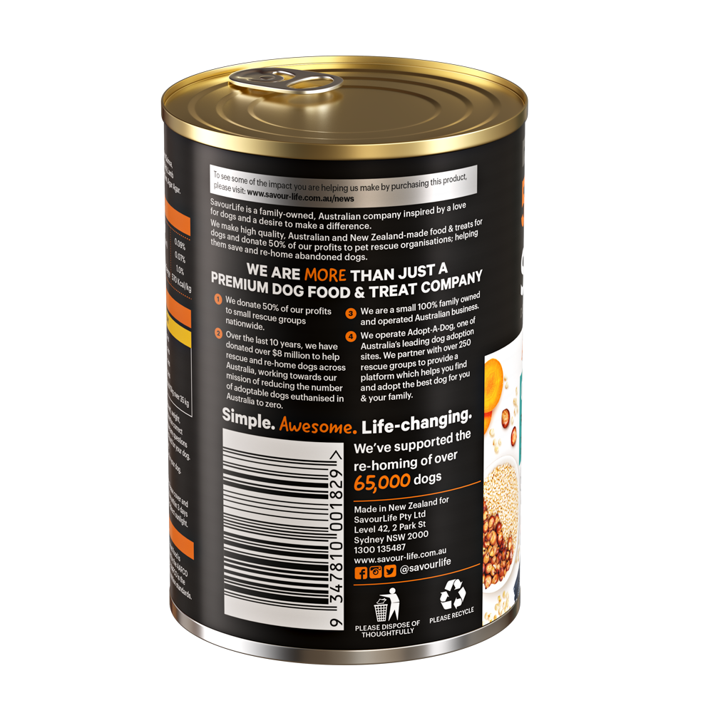 SavourLife's Ancient Grain’s canned dog food recipes have been specially batched to consist of 90% Meat, Organs and Superfoods; and topped with all the essential vitamins & minerals to create a complete and balanced meal. The result is an irresistibly tasty, loaf-like meaty food that is packed with nutrients that closely mimic your dog’s ancestral diet ensuring they thrive every day.