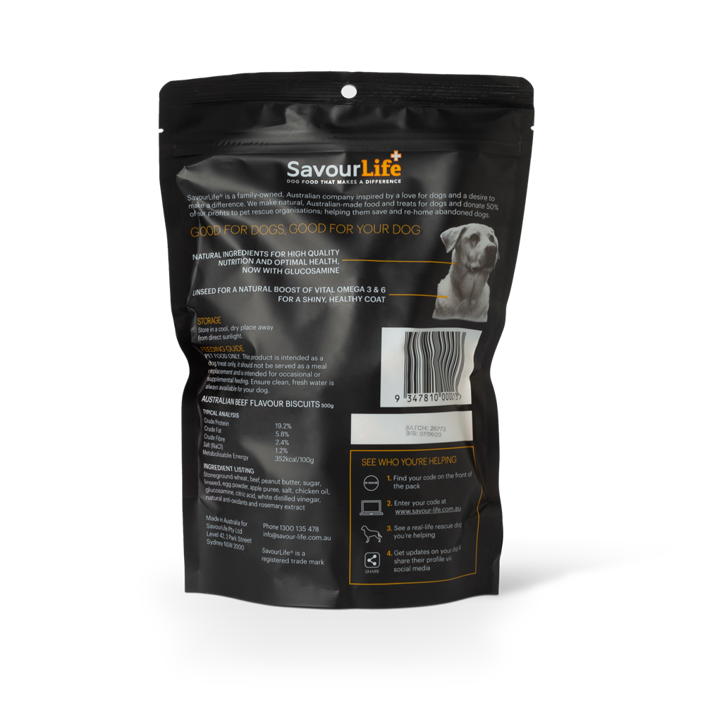 SavourLife's all-natural, oven-baked Australian Beef Flavour Biscuits contain no artificial flavours, colours or preservatives. Our protein-packed biscuits are made from Australian ingredients including real Australian beef, eggs and whole Linseed. We use only the best natural ingredients for optimal health and nutrition, then we bake them to perfection, giving them a crunchy texture, which is great for promoting healthy teeth and gums. The addition of extra Linseed gives a natural boost of vital Omega 3&6 acids and is an added benefit in our Shiny Coat Formula. The perfect choice for a healthy and delicious treat for your dog.