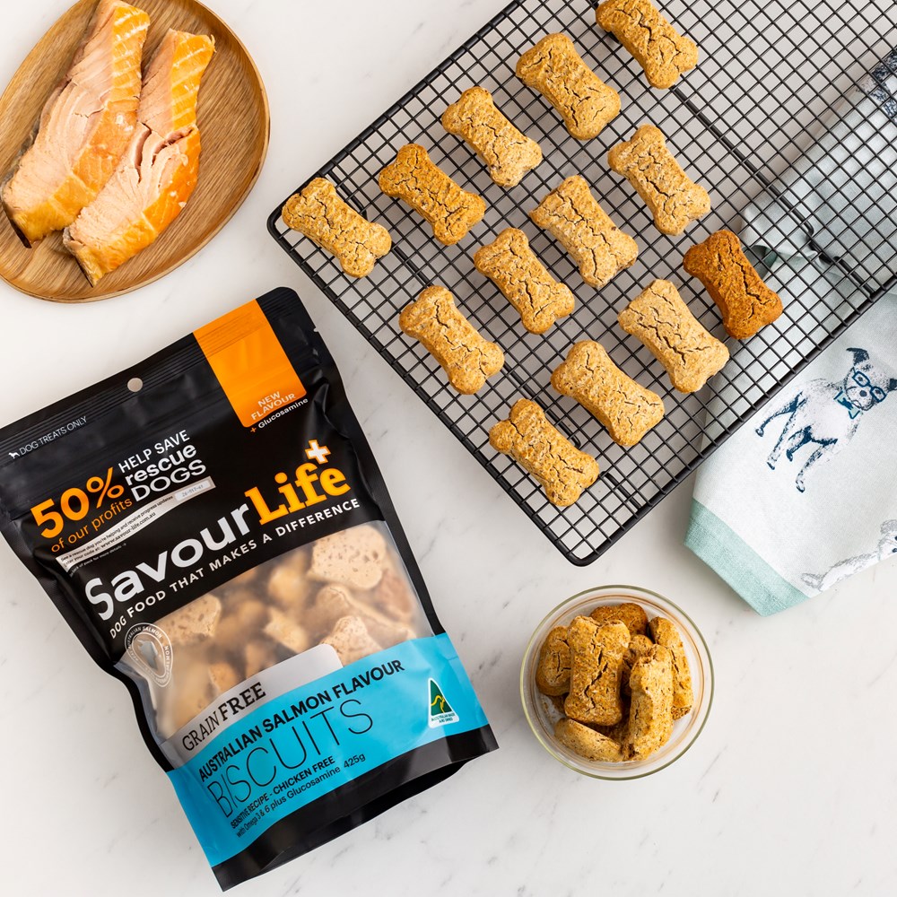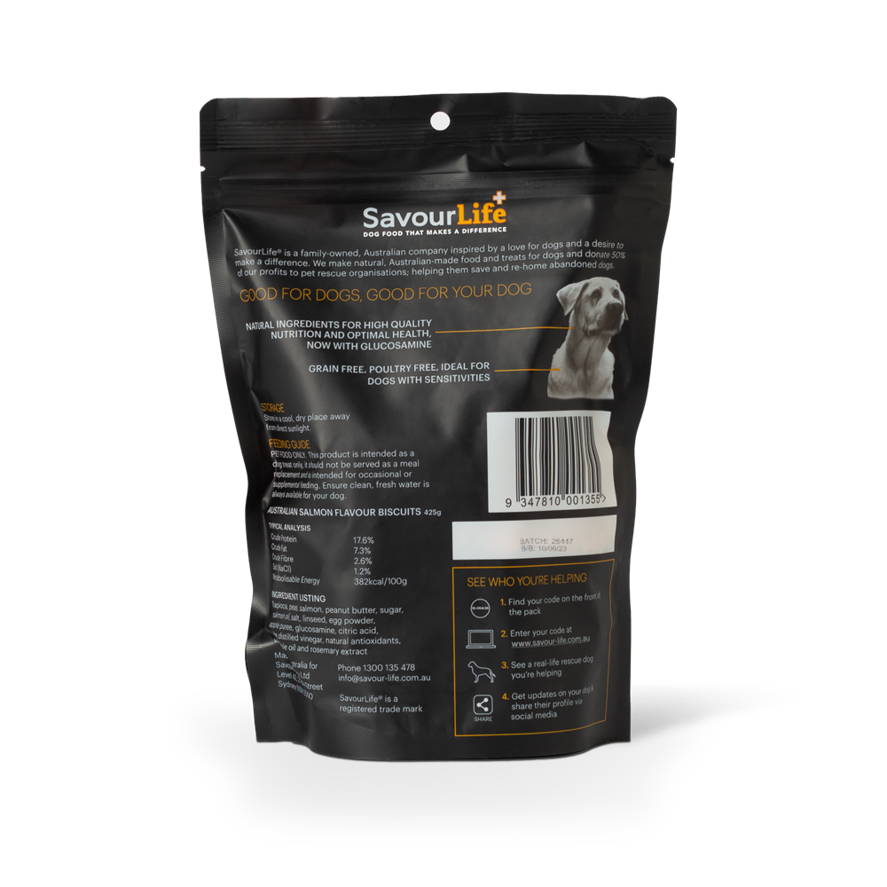 SavourLife's all-natural, oven-baked Australian Salmon Grain Free Flavour Biscuits contain no artificial flavours, colours or preservatives. Our protein-packed biscuits are made from Australian ingredients including real Australian Salmon, eggs and whole Linseed. Specially formulated for dogs with sensitivities to grain. We use only the best natural ingredients for optimal health and nutrition, then we bake them to perfection, giving them a crunchy texture, which is great for promoting healthy teeth and gums. The addition of extra Linseed gives a natural boost of vital Omega 3 & 6 acids. Now with glucosamine. The perfect choice for a healthy and delicious treat for your dog.
