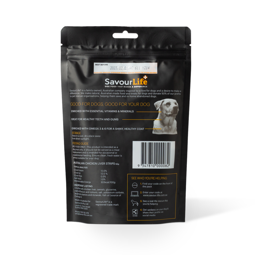 SavourLife’s delicious Australian Liver Strips are made with chicken, great for dogs with allergies to beef, contain no artificial flavours or colours and are made from real Australian meat. They are enriched with essential vitamins and minerals for better health and the addition of Fish Oil gives a natural boost of vital Omega 3 & 6 which is perfect for a shiny, healthy coat. We use a special drying process to capture the natural goodness and their naturally chewy texture is great for promoting healthy teeth and gums. A delicious treat for dogs of all shapes and sizes.