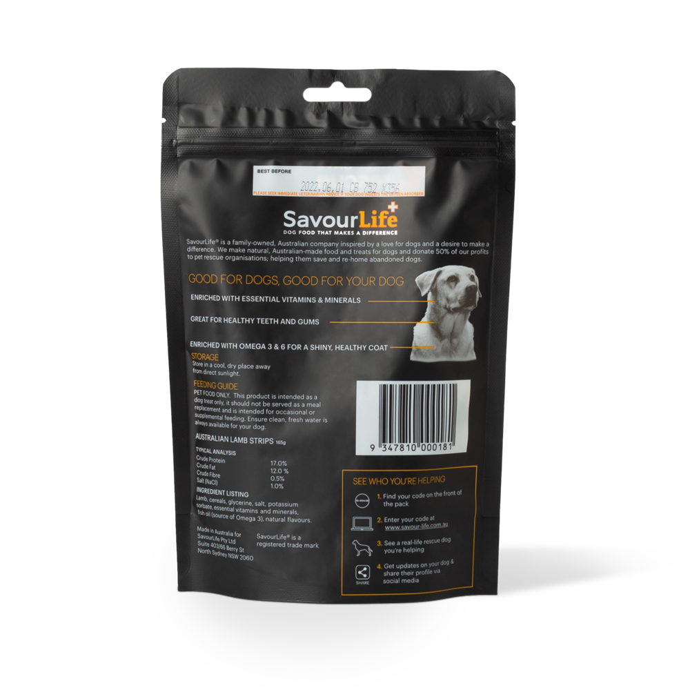 SavourLife's delicious Australian Lamb Strips contain no artificial flavours or colours and are made from real Australian meat! They are enriched with essential vitamins and minerals for better health and the addition of fish oil gives a natural boost of vital Omega 3 & 6 for a shiny and healthy coat. We use a special drying process to capture the natural goodness and their naturally chewy texture is great for promoting healthy teeth and gums. A delicious, healthy treat for dogs of all shapes and sizes.