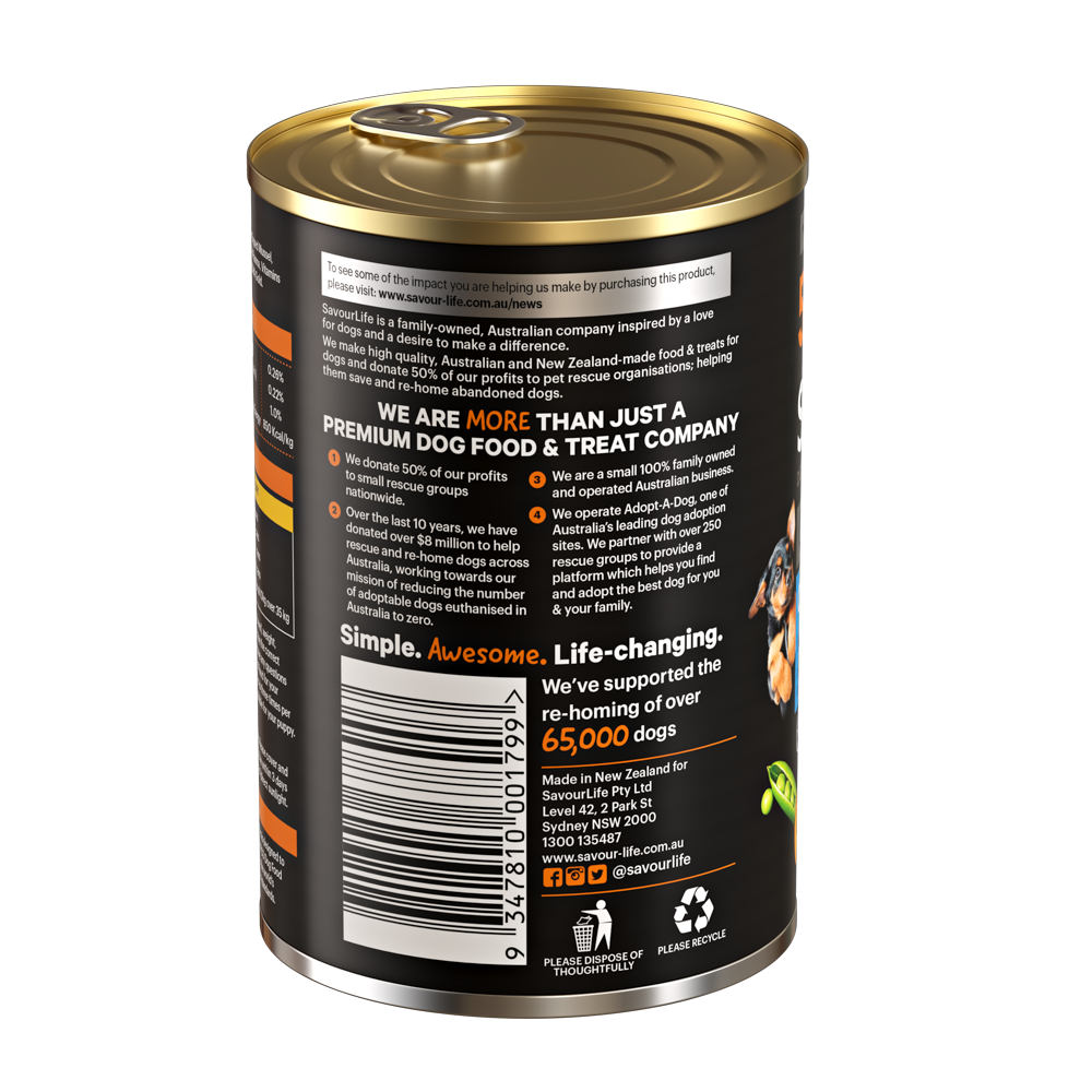 SavourLife's Grain Free canned dog food recipes have been specially batched to consist of 95% Meat, Organs, New Zealand Green Lipped Mussel and Superfoods; and topped with all the essential vitamins & minerals to create a complete and balanced meal. The result is an irresistibly tasty, loaf-like meaty food that is packed with nutrients that closely mimic your dog’s ancestral diet ensuring they thrive every day.